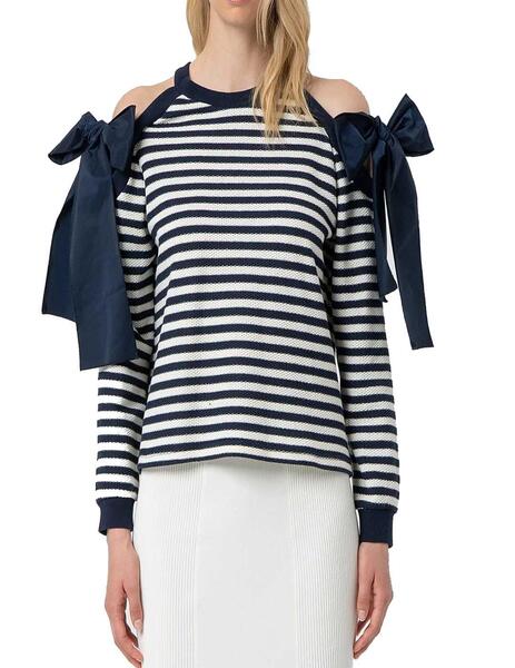 Jersey. Fracomina. A rayas marineras en blanco y azul marino. Detalle en mangas de lazadas en tejido.Manga larga, con hombros descubiertos. Cuello Halter.